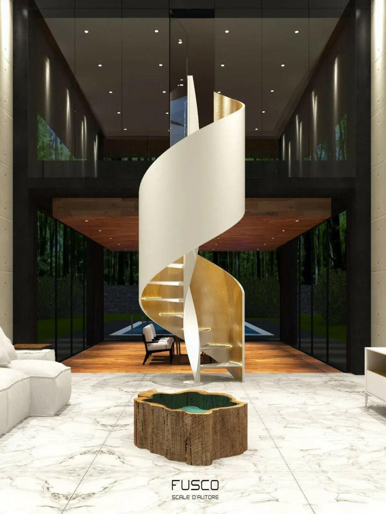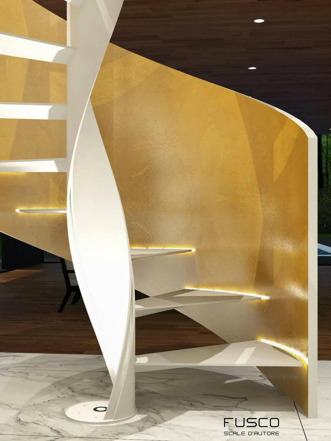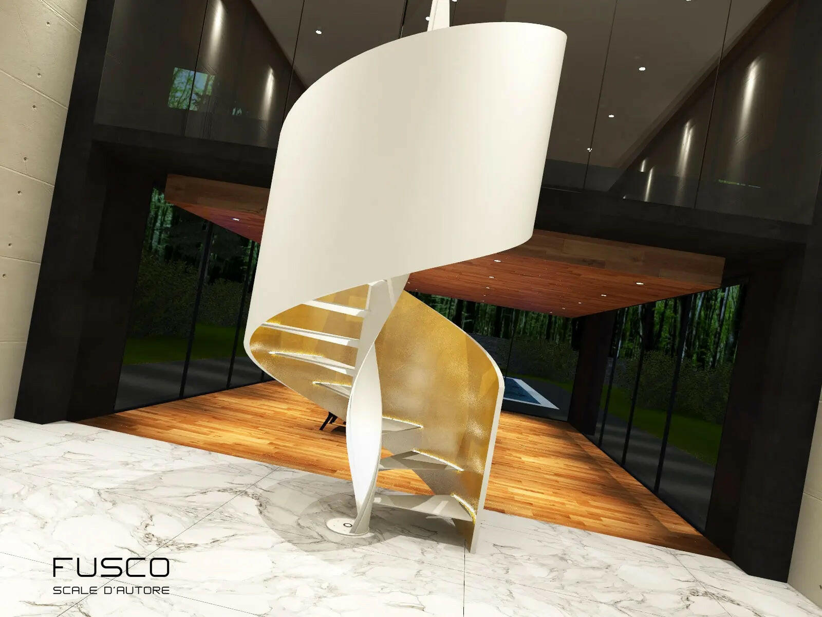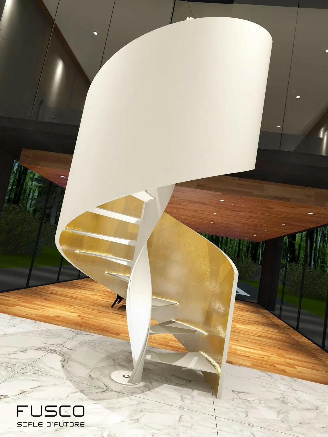- Scala elicoidale cilindrica, caratterizzata da una struttura sinuosa e avvolgente, progettata per un impatto estetico moderno e sofisticato.