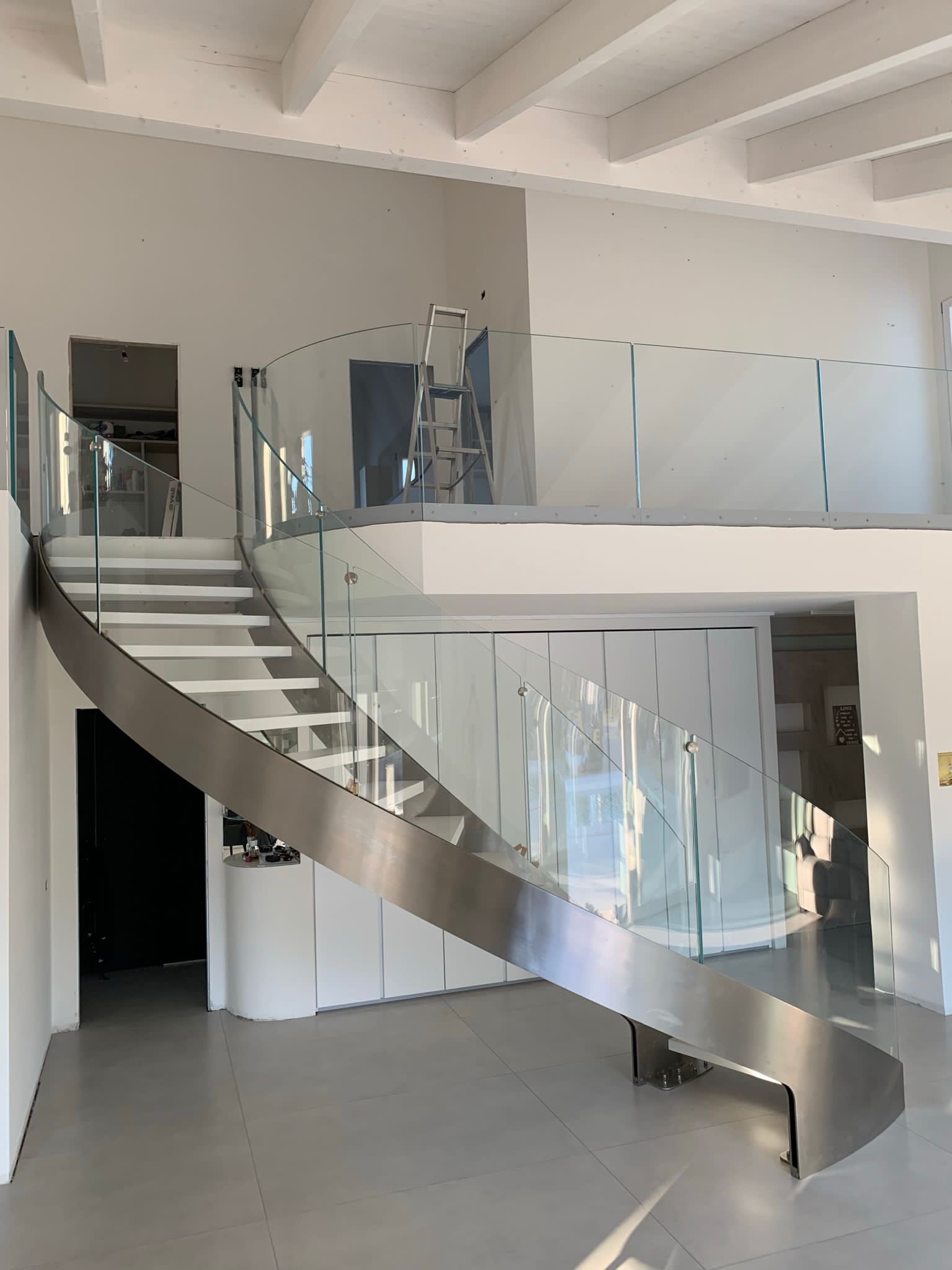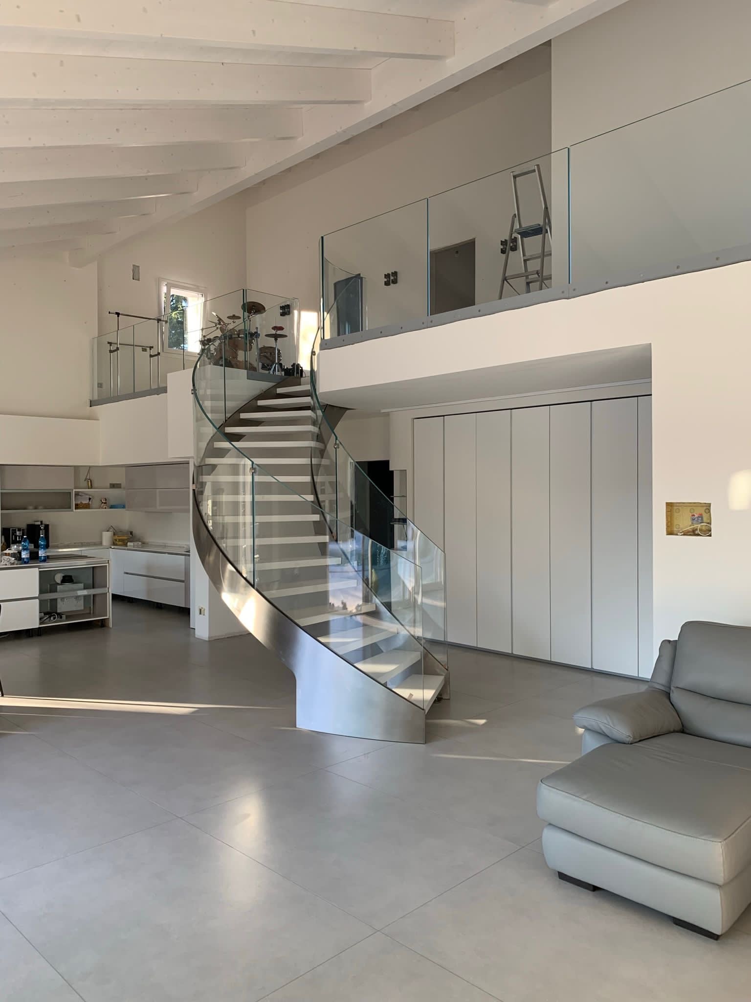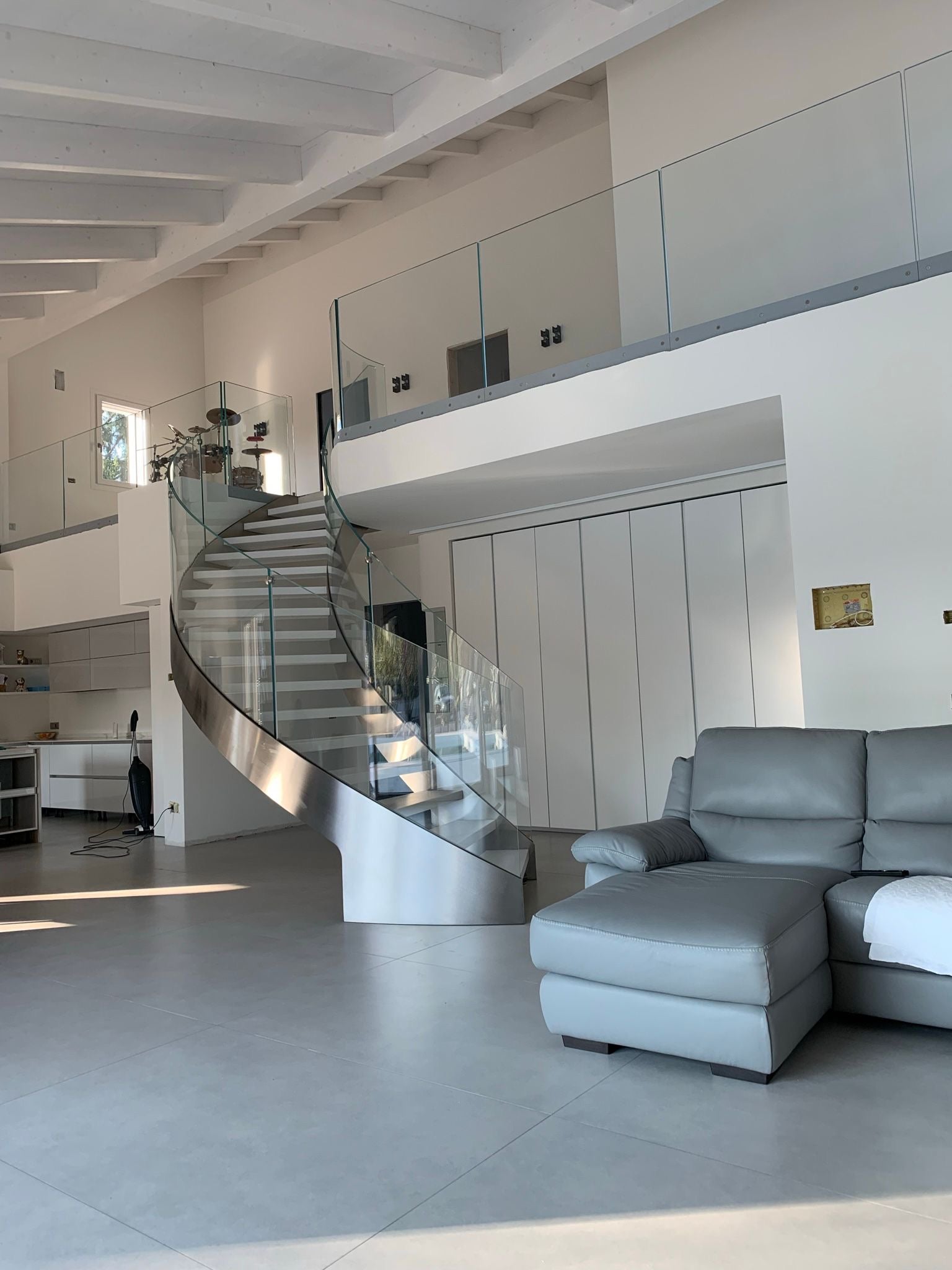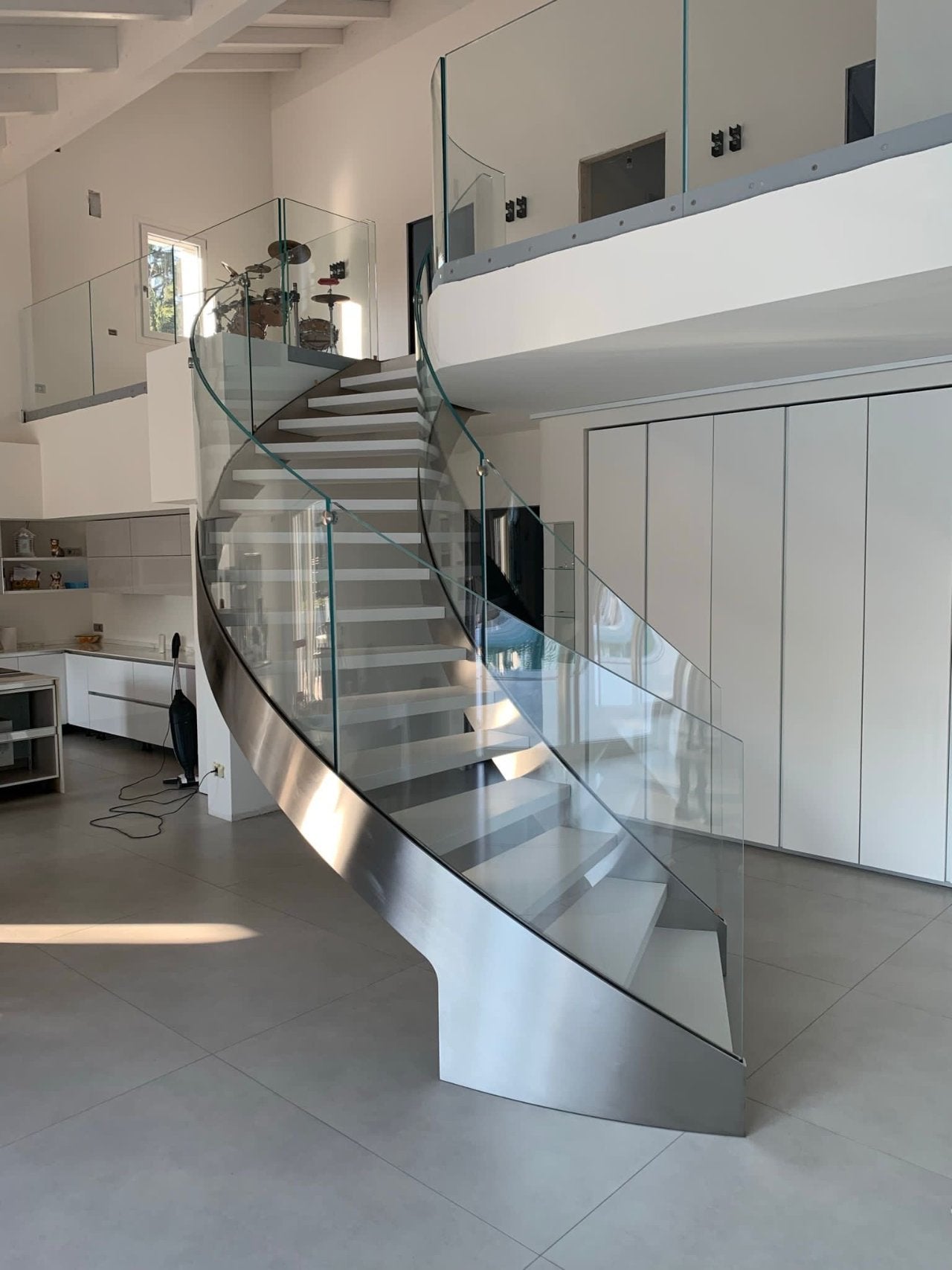 La scala elicoidale modello Plane rappresenta una soluzione innovativa ed elegante, caratterizzata da un design moderno e lineare, con doppio fascione laterale e parapetto in cristallo. Ideale per ambienti contemporanei, offre un equilibrio perfetto tra estetica, funzionalità e sicurezza.