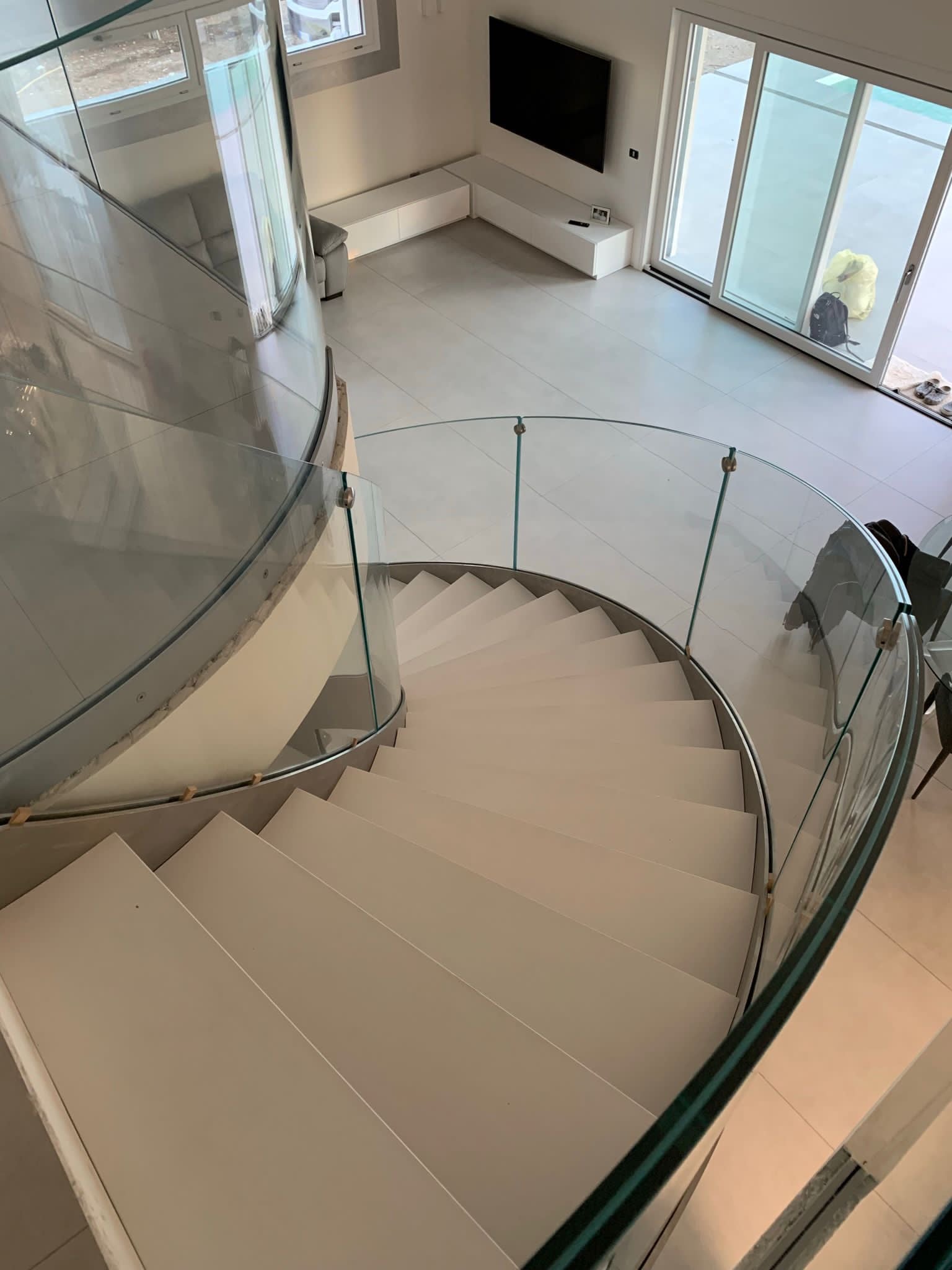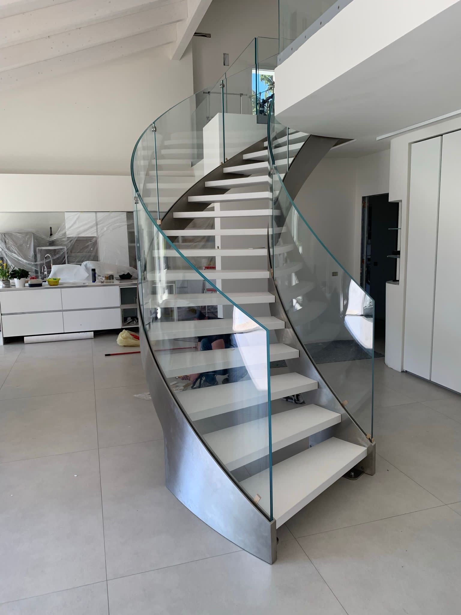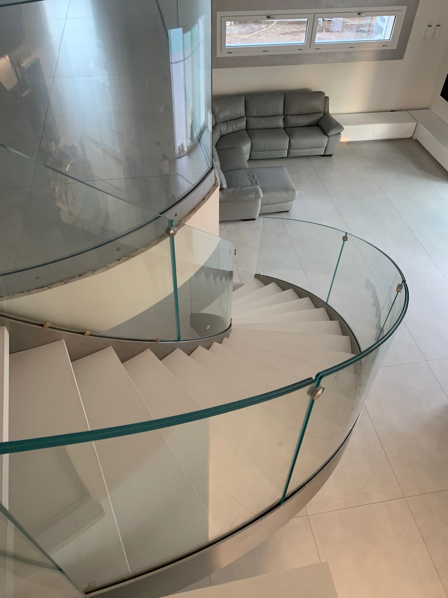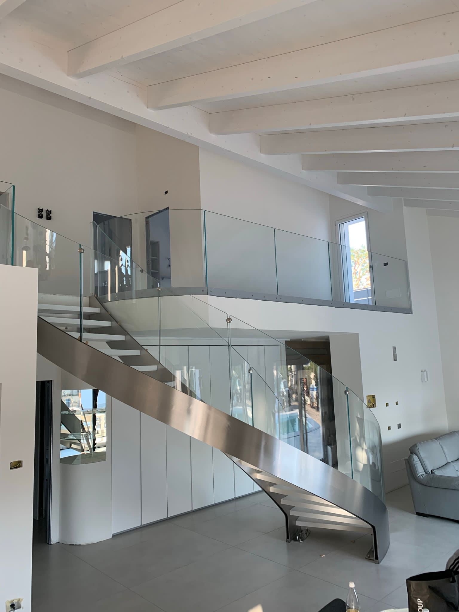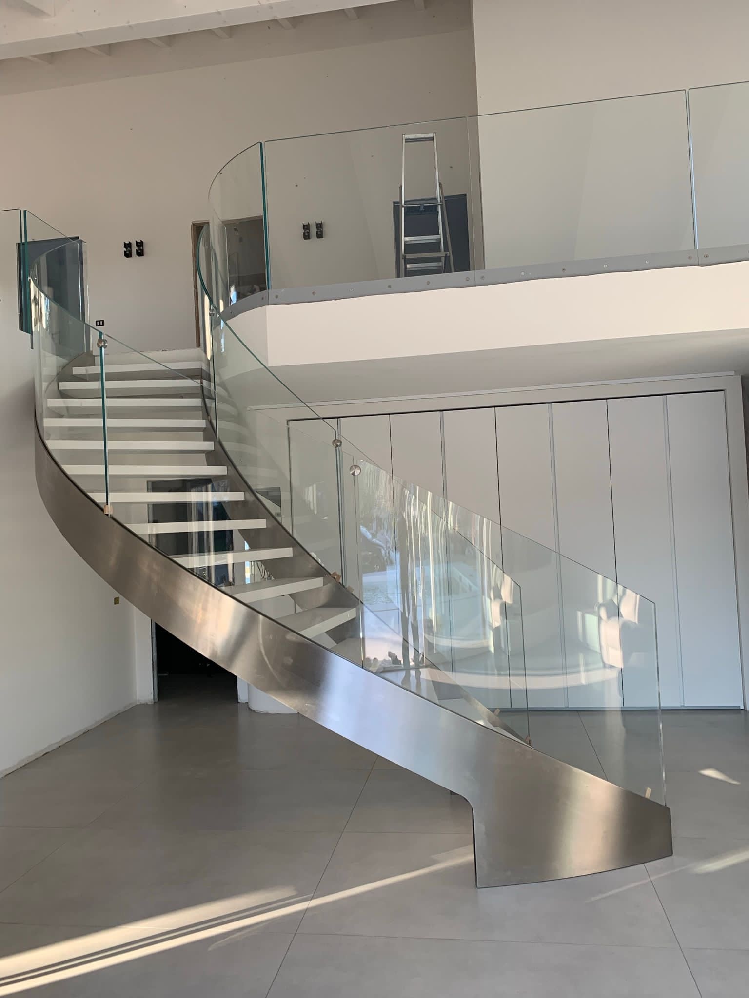 La scala elicoidale modello Plane rappresenta una soluzione innovativa ed elegante, caratterizzata da un design moderno e lineare, con doppio fascione laterale e parapetto in cristallo. Ideale per ambienti contemporanei, offre un equilibrio perfetto tra estetica, funzionalità e sicurezza.