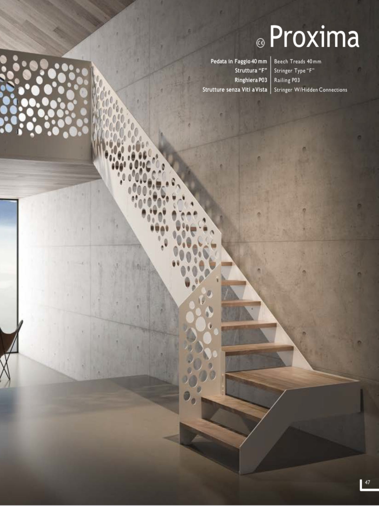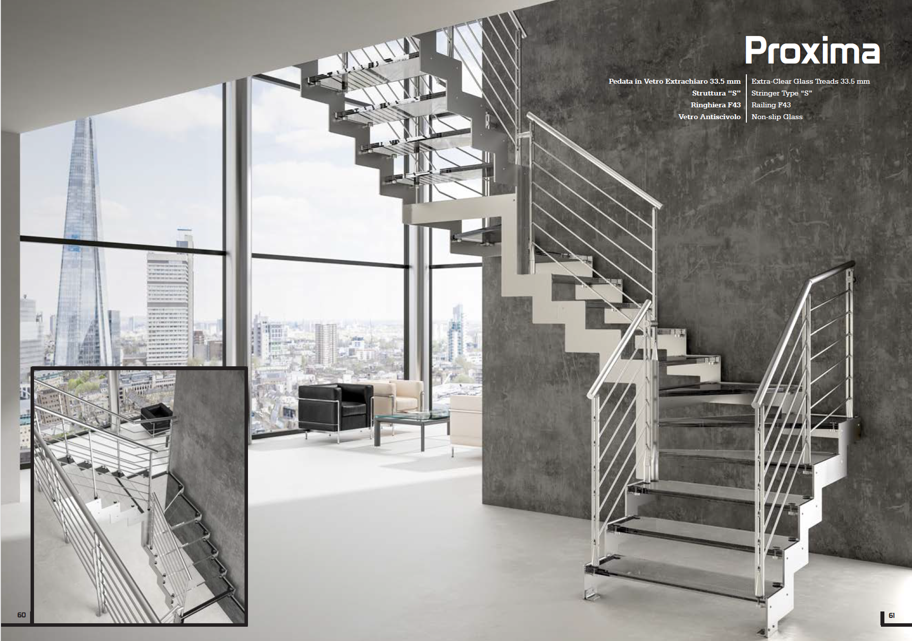 Ispirata all’architettura contemporanea, la scala Proxima unisce eleganza e innovazione, creando un punto focale di grande impatto estetico. Le sue linee pulite e raffinate evocano un senso di leggerezza e armonia, trasformandola in un elemento distintivo capace di valorizzare qualsiasi ambiente di prestigio. Più di una semplice struttura, è un'opera di design che coniuga forma e funzione in perfetta sintesi.