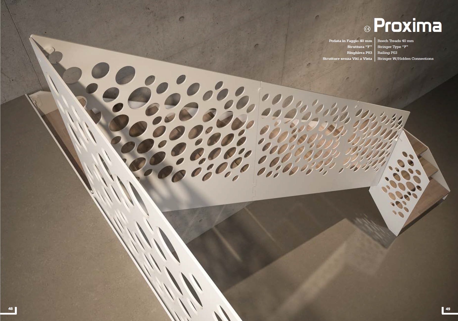 La scala a giorno Proxima con fascione in metallo su ogni lato.Spessore 8mm con forme a Saltarello e Cremagliera, verniciate a polvere epossidica con colore a scelta nostro campionario o Lamiera di Acciaio Inox AISI304 spessore 8mm con forme a Fascione, Saltarello e Cremagliera con finitura superficiale Satinato.