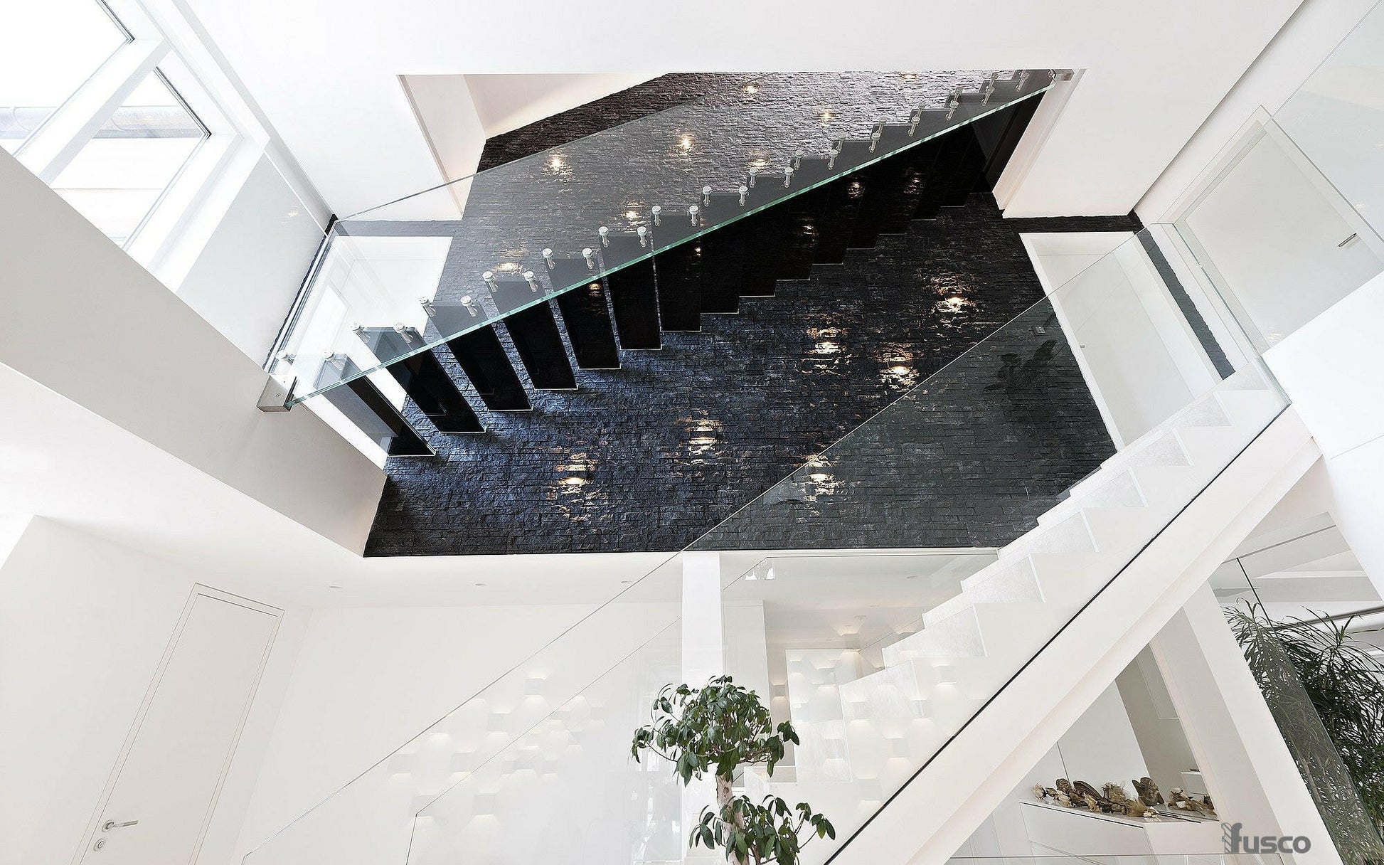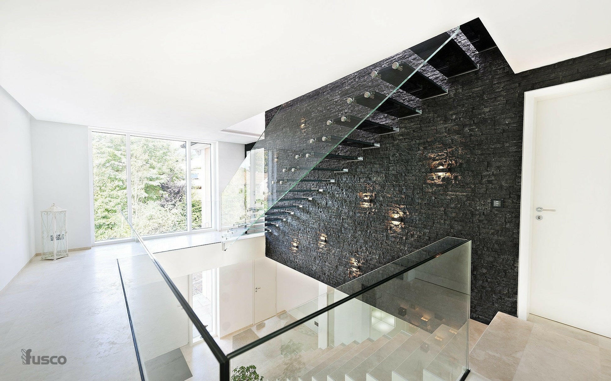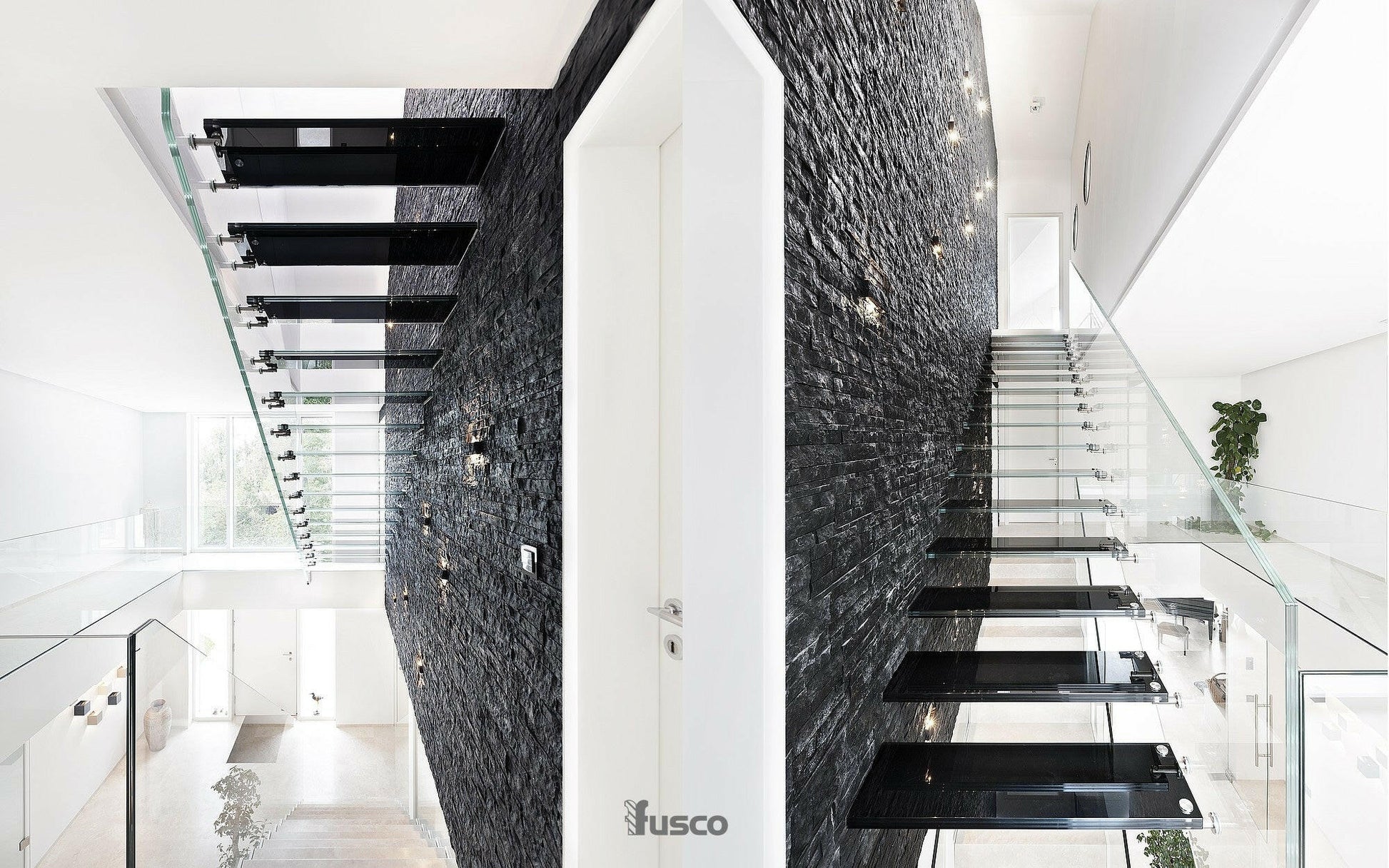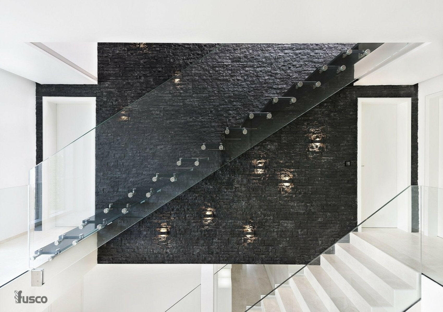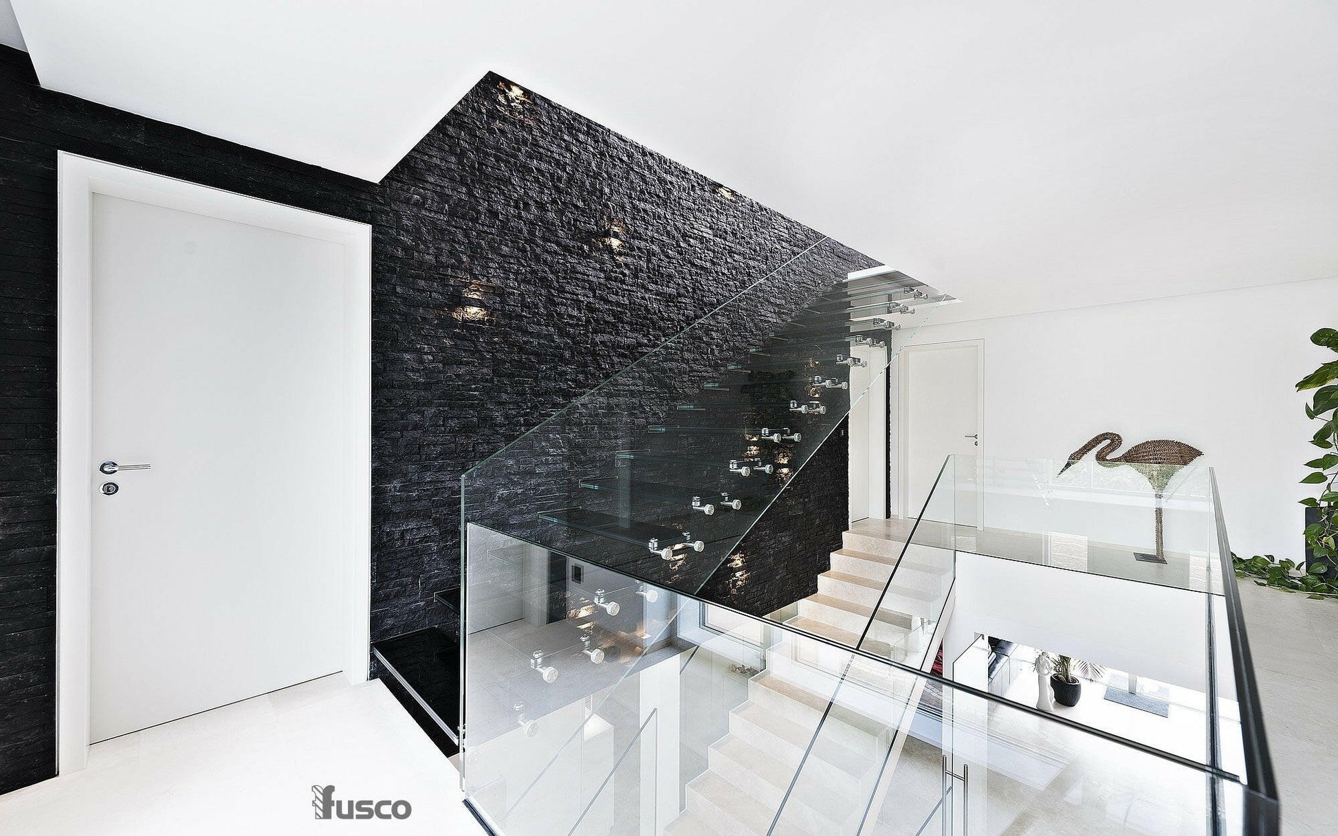 - Scala a sbalzo con struttura portante completamente nascosta all’interno del muro, per un effetto di leggerezza e sospensione unica.