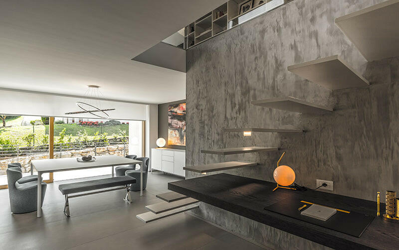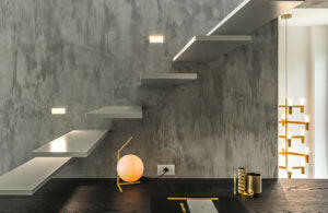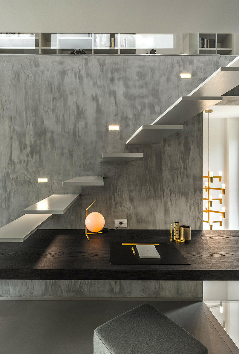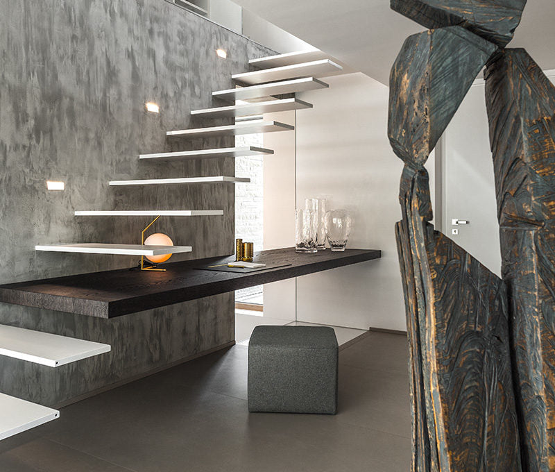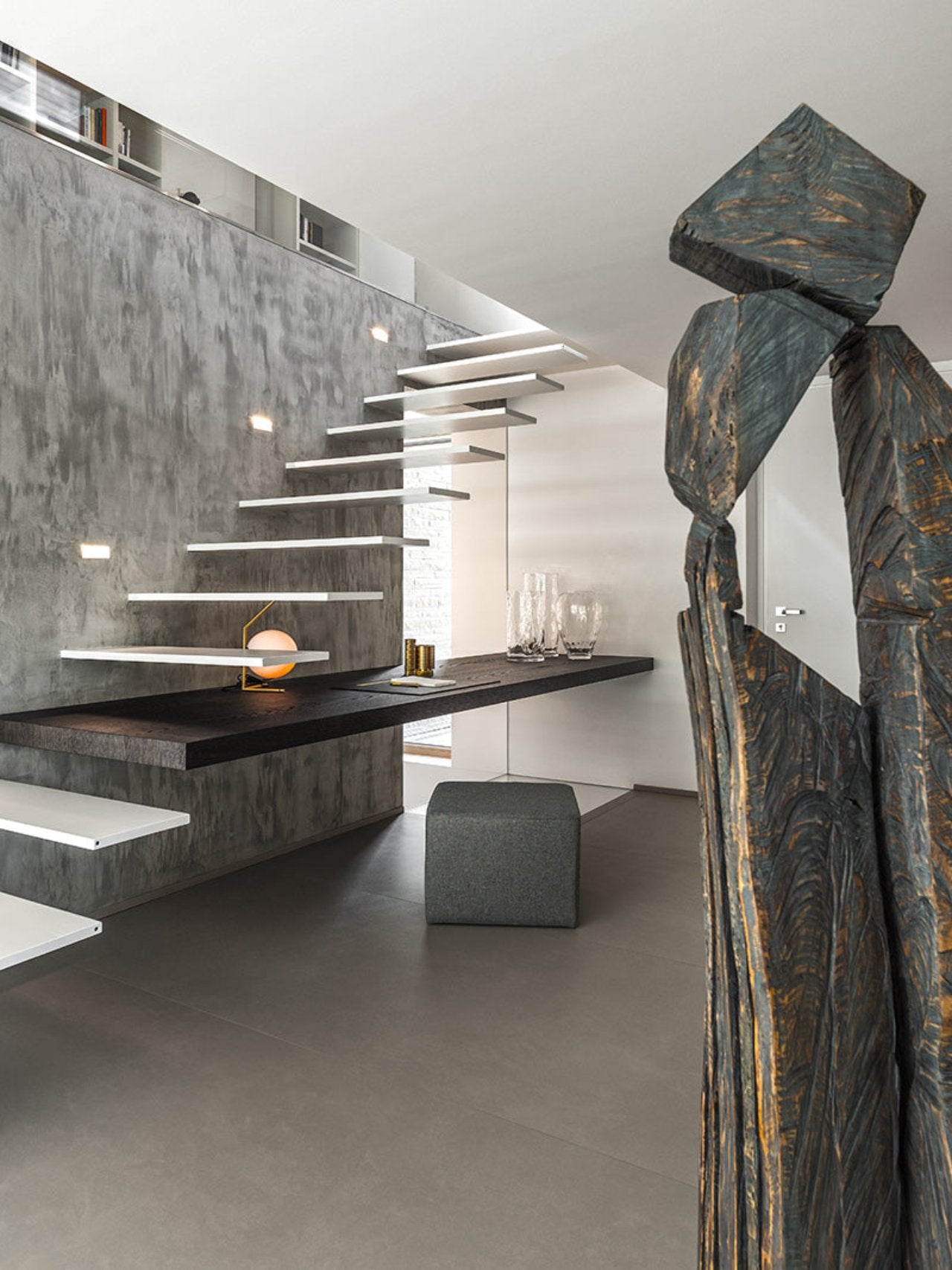 - Gradini ancorati direttamente alla parete portante mediante sistemi di fissaggio ad alta resistenza, nascosti per mantenere la pulizia del design.